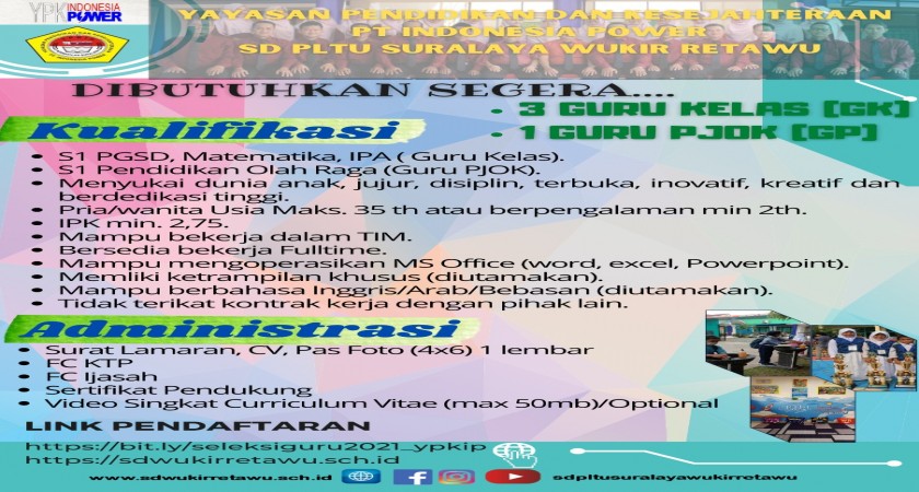 Di penghujung Tahun 2021, SD Wukir Retawu "Memanggil" Guru Profesional untuk bergabung dengan sekolah. Kami mencari guru berjiwa "Pembelajar" untuk mengajar dan mendidik anak-anak dengan penuh Cinta Kasih.